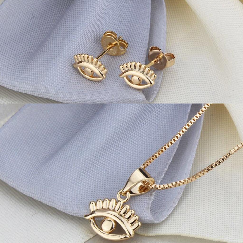 Reinventa tu mejor look con este set cadenita dije 1 cm y topos mini ojo turco de 0.7mm en Cover Gold.