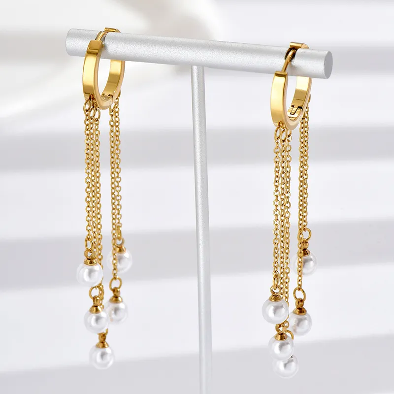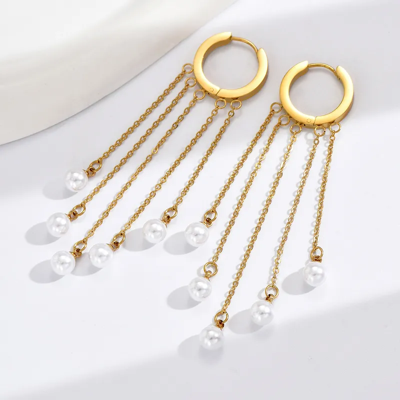 Agrega un toque elegante y sofisticado a tus accesorios con nuestras «Candongas Doradas». Cada candonga presenta cinco cadenas que cuelgan con una perla en el extremo, creando un accesorio que combina movimiento y delicadeza. Lleva contigo la belleza clásica y el estilo refinado en cada detalle de estas candongas.