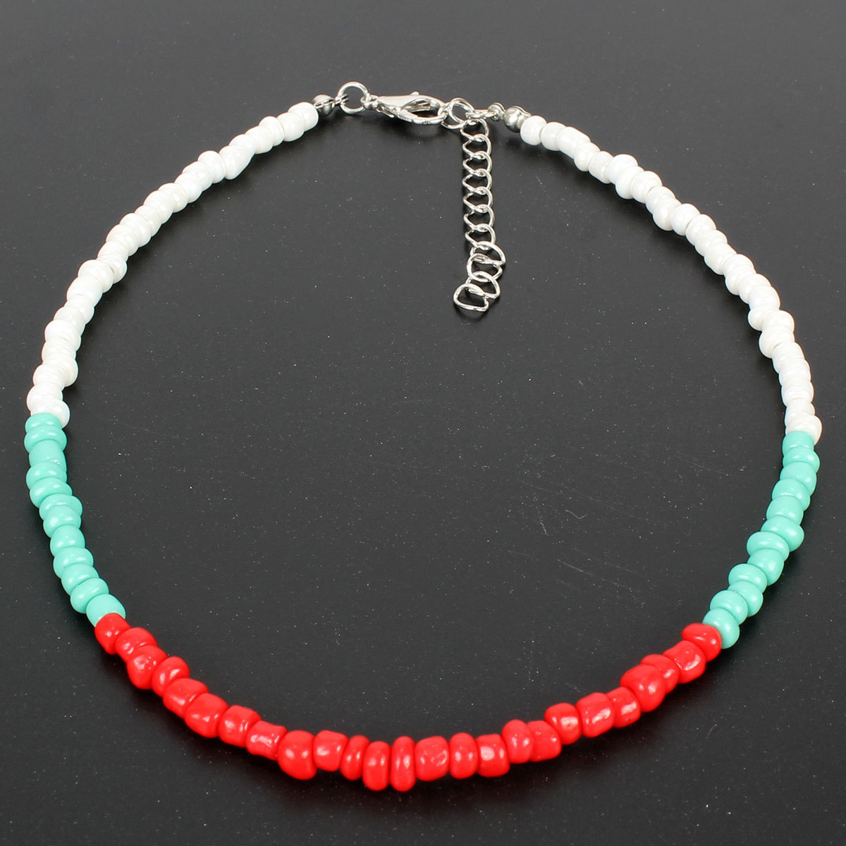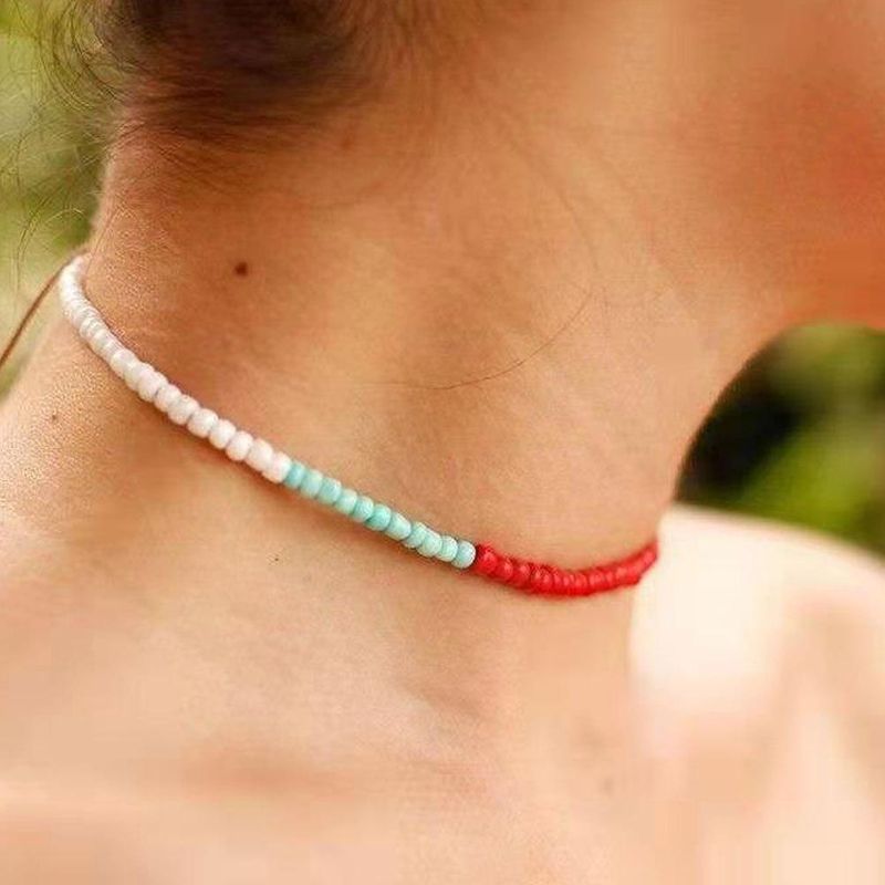 Collar artesanal en chaquiras combinación de colores blanco, aguamarina y rojo.