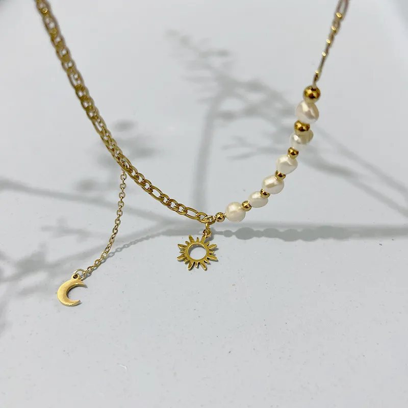 Combina la elegancia clásica de las perlas con el encanto celestial del sol y la luna en nuestro collar único. La parte de perlas y cadena dorada se fusionan en un diseño que refleja la dualidad del día y la noche. Los colgantes de sol y luna añaden un toque de magia y misterio a este accesorio, creando un look versátil que resalta tu estilo y conexión con el cosmos.