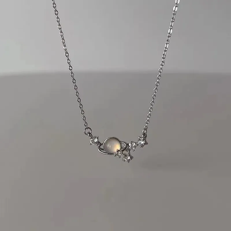 Esta cadena presenta un encantador planeta como detalle central, rodeado de pequeñas figuras de estrellitas de piedras brillantes diamante imitación. Lleva contigo la belleza del cosmos y el brillo en cada detalle de esta cadena.