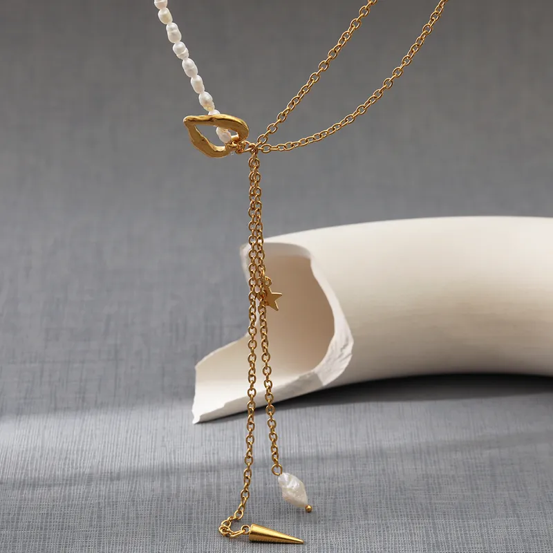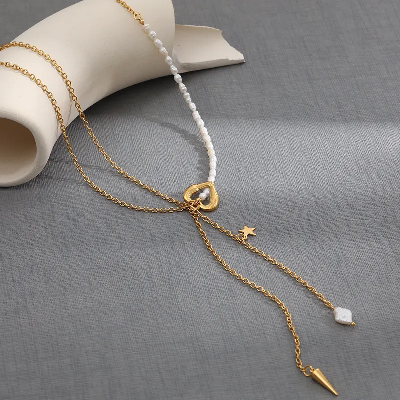 Complementa tu estilo con nuestro Collar Dorado: mitad Perlas y mitad Doble Cadena, con Detalles Encantadores. Este collar combina la elegancia de las perlas con la modernidad de las cadenas, creando un accesorio único. El dije de corazón hueco y la estrellita añaden un toque de encanto, mientras que las tiras de cadena cuelgan con gracia. Lleva contigo una combinación de elegancia y estilo en cada paso.