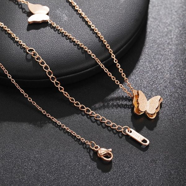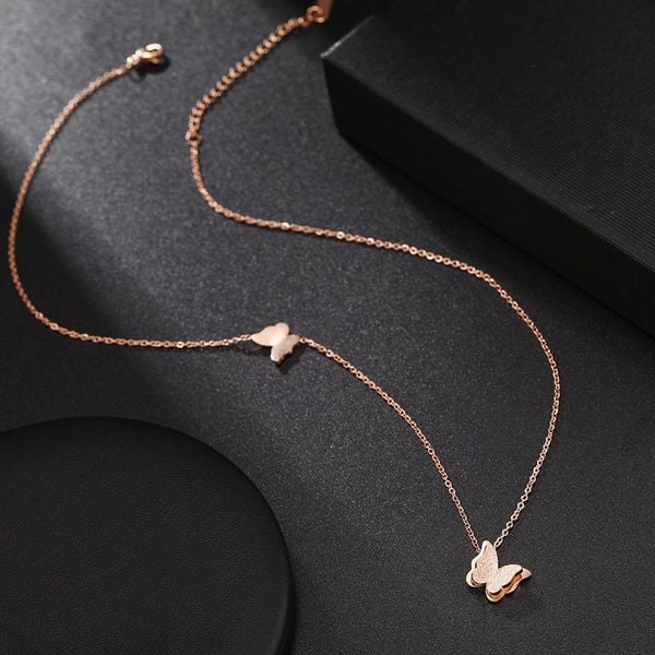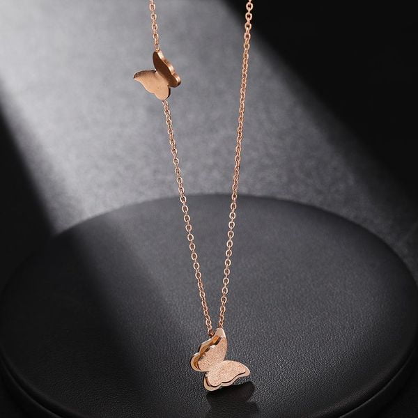 Collar doble mariposa de cadena delgada fabricado en acero de titanio rosa.