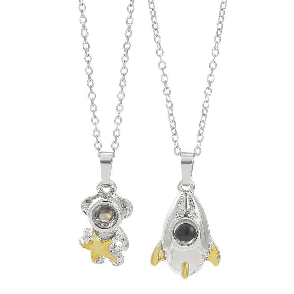 Lleva tu estilo a nuevas alturas con nuestro dúo de cadenitas plateadas de estilo espacial en forma de astronauta y cohete. Este accesorio único captura la maravilla y la aventura del espacio en un diseño que resalta tu personalidad creativa. El astronauta y el cohete añaden un toque de intriga y exploración, convirtiendo este collar en un verdadero punto focal. El tono plateado agrega un brillo metálico que complementa perfectamente el tema espacial. Ya sea que seas un amante de la ciencia ficción o simplemente busques un toque cósmico en tu estilo, este collar es la elección perfecta para destacar con audacia.