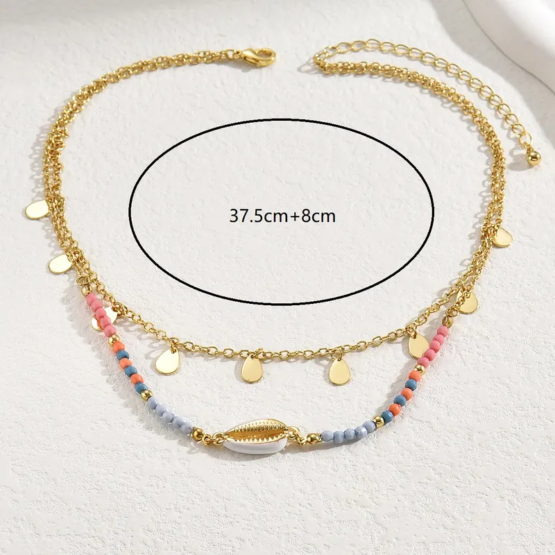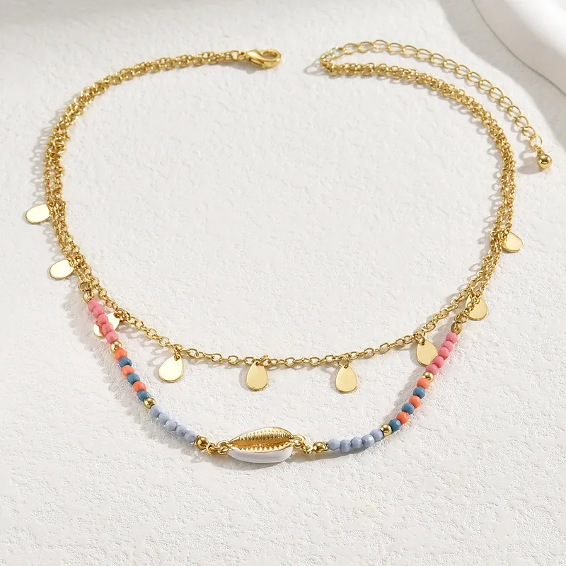 Este collar presenta una combinación única de elementos, con una cadena de gotas doradas y otra cadena de cuentas en tonos pastel unidas en un solo broche , culminando en una concha blanca en el centro. Lleva contigo la elegancia y la frescura en cada detalle de este collar.