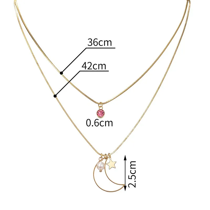 Este collar encantador presenta un dije de luna en tono dorado suspendido en una doble cadena, creando un diseño único y elegante. El tono dorado agrega un brillo cálido y sofisticado. Lleva contigo la magia de la luna y el encanto de las cadenas dobles con este collar que te conecta con el cielo y realza tu look con un toque celestial.