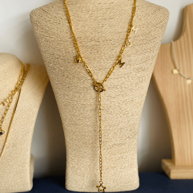 Dale a Mamá un regalo que exprese tu amor eterno con nuestra cadenita dorada en aluminio. Los dijes de letras «Mom», estrella y corazón en oro golfi la harán sentirse especial cada día. Este lindo accesorio no solo añade elegancia a su atuendo, sino que también lleva tus sentimientos cerca de su corazón. Celebra el vínculo madre-hijo con esta joya que captura la belleza y el afecto en cada detalle.