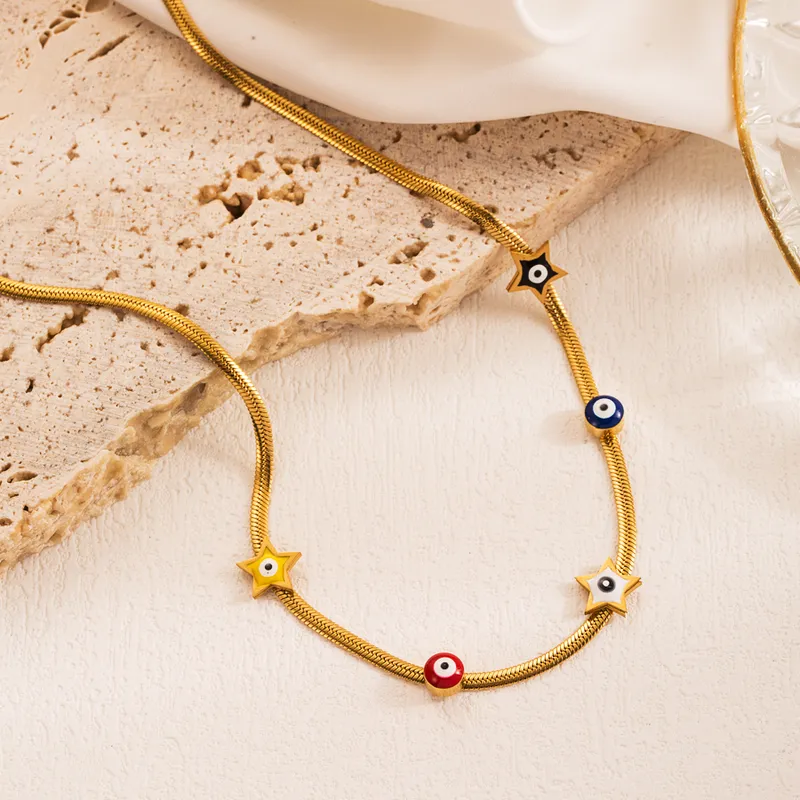 Agrega protección y estilo a tu cuello con nuestro collar de cadena plana dorada. La estrella de ojo turco y los círculos de ojos turcos aportan un significado especial y un diseño cautivador. Celebra la tradición y la belleza en un accesorio que te acompaña con su encanto y poder espiritual.