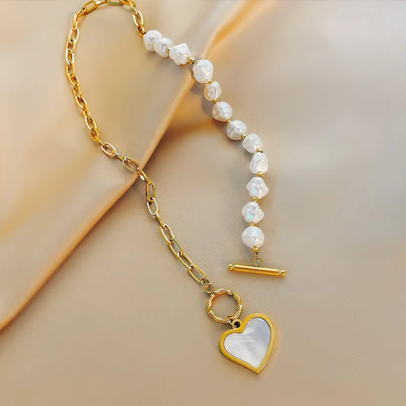 Completa tu look con nuestro elegante collar de perlas. Las perlas combinadas con una cadena dorada y un corazón en nácar, resaltan la belleza y el estilo en cada detalle. El broche dorado en círculo agrega un toque de sofisticación a esta joya clásica. Lleva la elegancia y la delicadeza de las perlas junto con un toque moderno de nácar en cada paso con este collar que combina tradición y encanto contemporáneo.