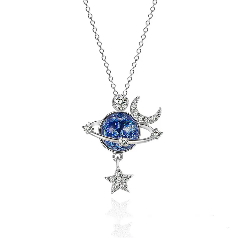 Collar Plateado, que presenta un Encantador Dije de Planeta Azul, adornado con una Estrella y una Luna de Circonitas Plateadas. Este collar combina la elegancia del plateado con la magia del espacio, creando un accesorio que captura la maravilla celestial. El dije de planeta, estrella y luna añaden un toque de encanto y brillo a tu look. Lleva contigo la belleza del cosmos con este collar cautivador.