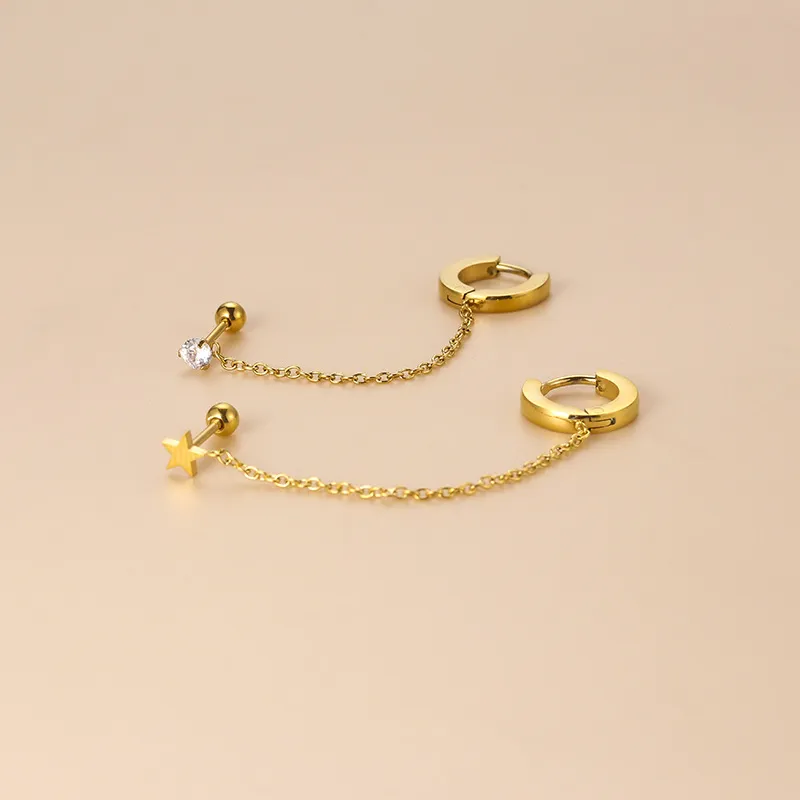 Añade un toque de estilo único a tus accesorios con nuestro Mini Earcuff Dorado con Terminación de Estrella o circon plateado. Este earcuff presenta una cadena dorada delicada que se sujeta en dos huecos de la oreja, con una terminación de estrella dorada o de piedra estilo diamante imitación que cuelga elegantemente. Logra un look moderno y llamativo.