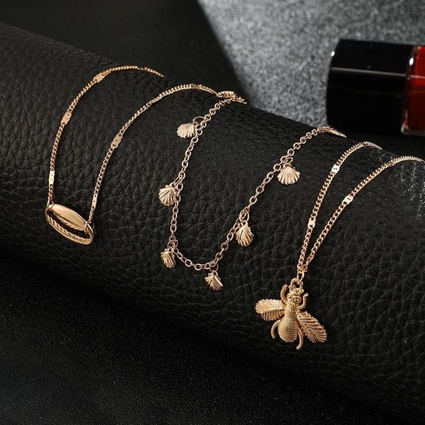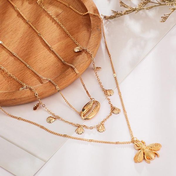 Tres cadenas doradas abejita y conchas de mar en un solo pasador, elaboradas en oro golfi.