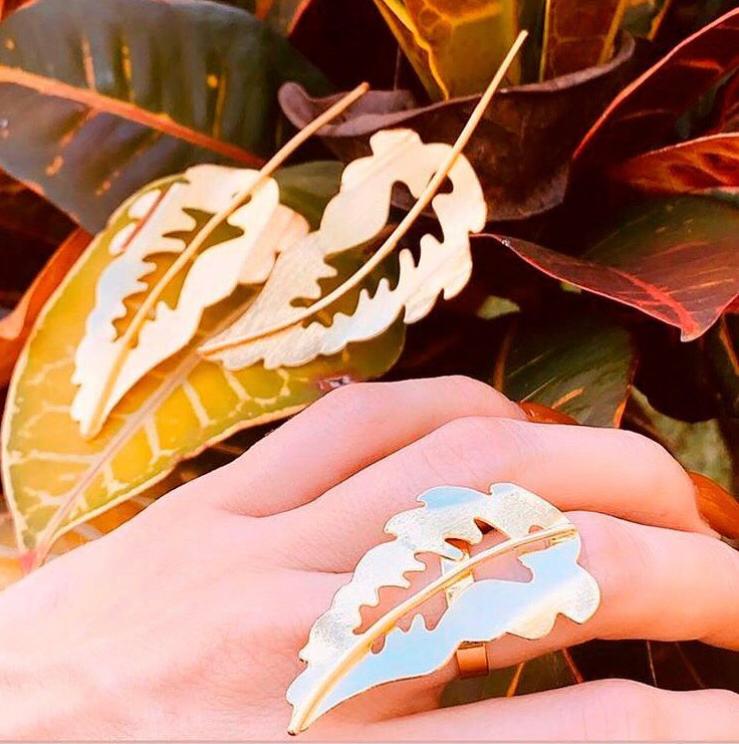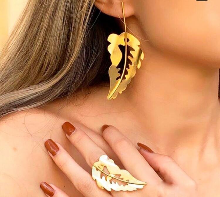 Set dúo aretes largos y anillo en forma de hojas hechos en bronce con baño de oro 24k.