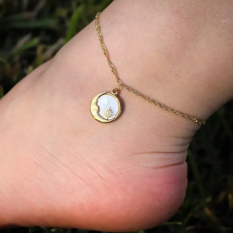 Eleva tus pasos con nuestra tobillera de luna dorada. La delicada luna en tono dorado brilla sobre el nácar blanco, creando un efecto celestial y sereno. Este accesorio combina elegancia y naturaleza en cada detalle, brindándote un toque de luminosidad y magia para adornar tus momentos especiales y tu estilo diario.