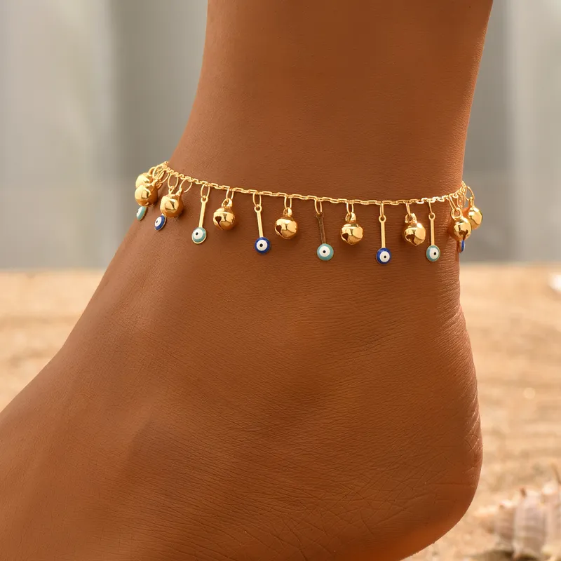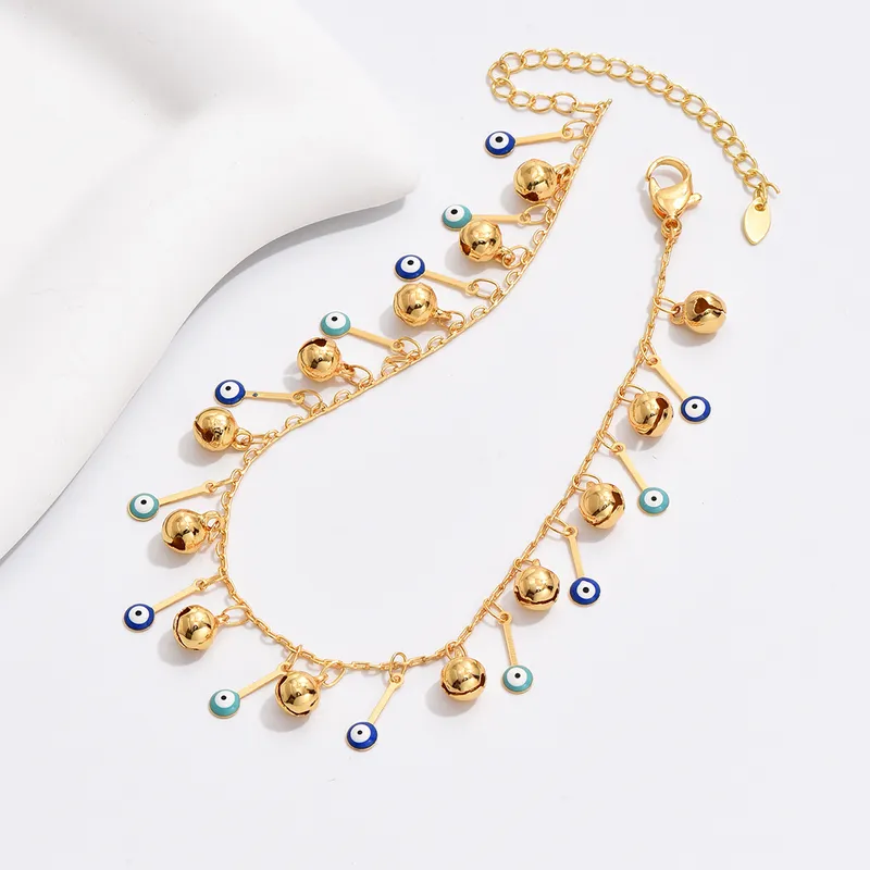 Embellece tus pasos con nuestra tobillera de ojos turcos en tonos azul claro y oscuro, acentuada por esferas doradas. Esta pieza única combina protección y elegancia, brindando un toque de encanto y espiritualidad a tu estilo veraniego. Una elección perfecta para quienes buscan llevar consigo la tradición y el brillo en cada paso.