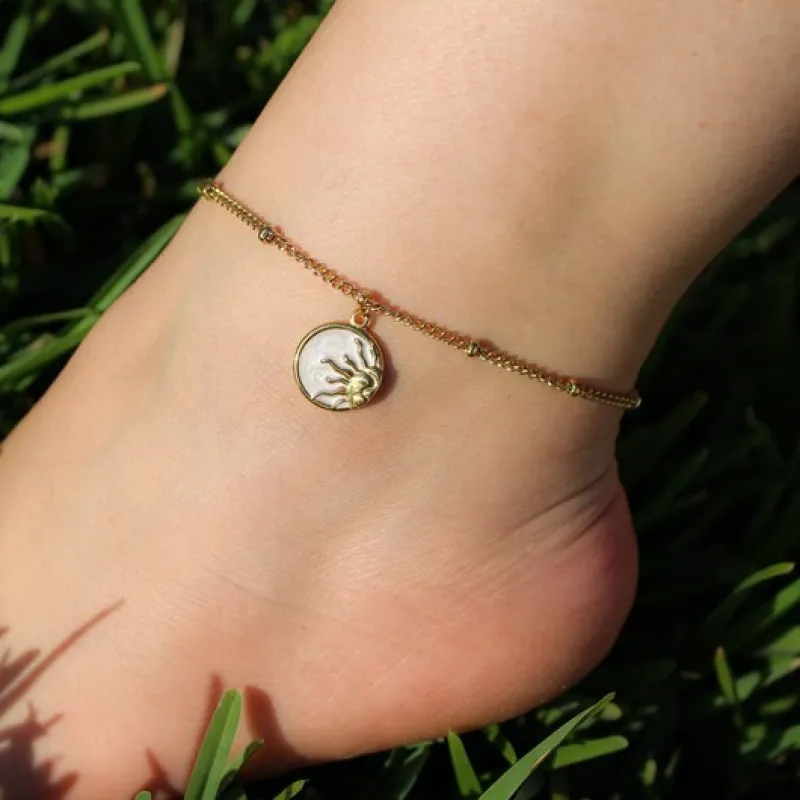 Brilla con la energía del sol y la serenidad del nácar con nuestra tobillera de sol sobre nácar. El sol radiante se posa sobre el fondo nacarado, creando un contraste de texturas y significados. Lleva la luz y la tranquilidad contigo en cada paso.